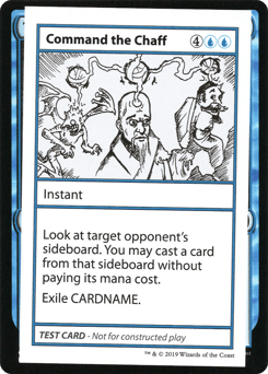 Look at target opponent's sideboard. You may cast a card from that sideboard without paying its mana cost. Exile Command the Chaff.