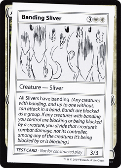 All Slivers have banding. (Any creatures with banding, and up to one without, can attack in a band. Bands are blocked as a group. If any creatures with banding you control are blocking or being blocked by a creature, you divide that creature's combat damage, not its controller, among any of the creatures it's being blocked by or is blocking.)