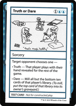 Target opponent chooses one — • Truth — That player plays with their hand revealed for the rest of the game. • Dare — Mill all but the bottom ten cards of that player's library. (To mill, put the top card of that library into its owner's graveyard.)