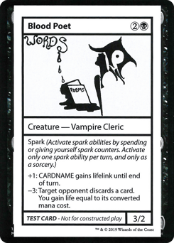 Spark (Activate spark abilities by spending or giving yourself spark counters. Activate only one spark ability per turn, and only as a sorcery.) +1: Blood Poet gains lifelink until end of turn. −3: Target opponent discards a card. You gain life equal to its converted mana cost.