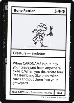 When Bone Rattler is put into your graveyard from anywhere, exile it. When you do, create four Reassembling Skeleton token cards and put them into your graveyard.