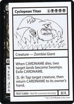 When Cyclopean Titan dies, two target lands become Swamps. Exile Cyclopean Titan. {3}, {T}: Tap target creature, then return Cyclopean Titan to its owner's hand.