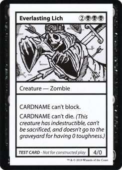 Everlasting Lich can't block. Everlasting Lich can't die. (This creature has indestructible, can't be sacrificed, and doesn't go to the graveyard for having 0 toughness.)