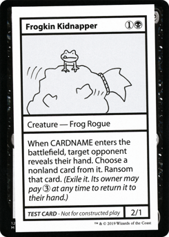 When Frogkin Kidnapper enters, target opponent reveals their hand. Choose a nonland card from it. Ransom that card. (Exile it. Its owner may pay {3} at any time to return it to their hand.)