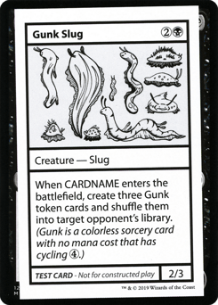 When Gunk Slug enters, create three Gunk token cards and shuffle them into target opponent's library. (Gunk is a colorless sorcery card with no mana cost that has cycling {4}.)