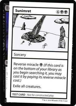 Reverse miracle {B} (If this card is on the bottom of your library as you begin searching it, you may cast it by paying its reverse miracle cost.) Exile all creatures.