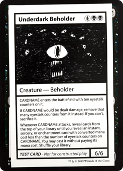Underdark Beholder enters the battlefield with ten eyestalk counters on it. If Underdark Beholder would be dealt damage, remove that many eyestalk counters from it instead. If you can't, sacrifice it. Whenever Underdark Beholder attacks, reveal cards from the top of your library until you reveal an instant, sorcery, or enchantment card with converted mana cost less than the number of eyestalk counters on Underdark Beholder. You may cast it without paying its mana cost. Shuffle your library.