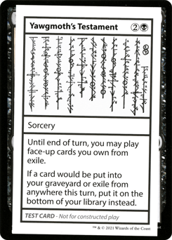 Until end of turn, you may play face-up cards you own from exile. If a card would be put into your graveyard or exile from anywhere this turn, put it on the bottom of your library instead.