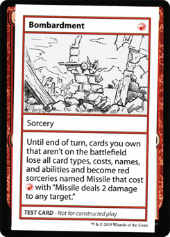 Until end of turn, cards you own that aren't on the battlefield lose all card types, costs, names, and abilities and become red sorceries named Missile that cost {R} with "Missile deals 2 damage to any target."