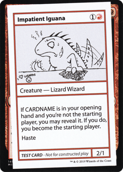 If Impatient Iguana is in your opening hand and you're not the starting player, you may reveal it. If you do, you become the starting player. Haste