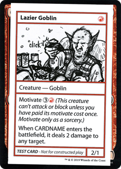 Motivate {3}{R} (This creature can't attack or block unless you have paid its motivate cost once. Motivate only as a sorcery.) When Lazier Goblin enters, it deals 2 damage to any target.