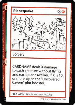 Planequake deals X damage to each creature without flying and each planeswalker. If X is 10 or more, open the "Uncovered Cavern" plot booster.