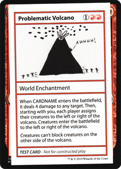 When Problematic Volcano enters, it deals 4 damage to any target. Then, starting with you, each player assigns their creatures to the left or right of the volcano. Creatures enter to the left or right of the volcano. Creatures can't block creatures on the other side of the volcano.