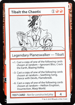[+1]: Cast a copy of one of the following cards chosen at random—Ignorant Bliss, Crack the Earth, Blazing Volley. [−3]: Cast a copy of one of the following cards chosen at random—Seething Song, Dance with Devils, Flamebreak. [−6]: Cast a copy of one of the following cards chosen at random—Hellion Eruption, Insurrection, Warp World.
