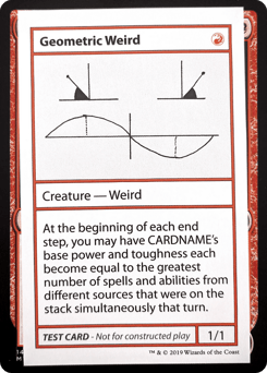 At the beginning of each end step, you may have Geometric Weird's base power and toughness each become equal to the greatest number of spells and abilities from different sources that were on the stack simultaneously that turn.