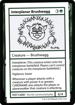 Interplanar (This creature enters onto the interplanar battlefield. Players can't control creatures on the interplanar battlefield.) Vigilance, haste Whenever a player attacks with a creature with power 4 or greater, Interplanar Brushwagg also attacks the player or planeswalker that creature is attacking.