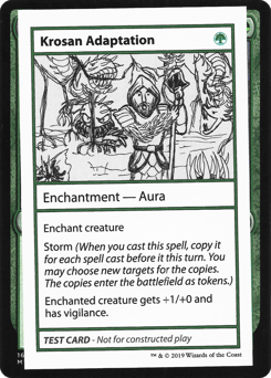 Enchant creature Storm (When you cast this spell, copy it for each spell cast before it this turn. You may choose new targets for the copies. The copies enter as tokens.) Enchanted creature gets +1/+0 and has vigilance.