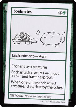 Enchant two creatures Enchanted creatures each get +1/+1 and have hexproof. When one of the enchanted creatures dies, destroy the other.