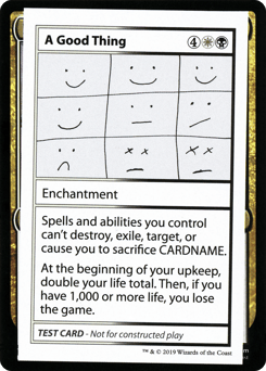Spells and abilities you control can't destroy, exile, target, or cause you to sacrifice A Good Thing. At the beginning of your upkeep, double your life total. Then, if you have 1,000 or more life, you lose the game.