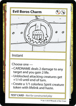 Choose one — • Evil Boros Charm deals 2 damage to any target and you gain 2 life. • Unblocked attacking creatures get +1/+0 until end of turn. • Create a 1/1 colorless Spirit creature token with lifelink and haste.