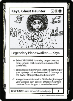 [0]: Exile Kaya, Ghost Haunter haunting target creature for as long as that creature remains on the battlefield. [−1]: You get an emblem with, "At the beginning of your upkeep, this emblem deals 3 damage to the owner of target haunted creature." [−2]: You get an emblem with, "At the beginning of your upkeep, gain control of target haunted creature for as long as it remains haunted."
