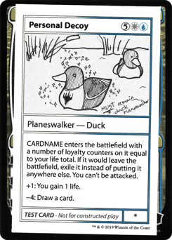 Personal Decoy enters with a number of loyalty counters on it equal to your life total. If it would leave the battlefield, exile it instead of putting it anywhere else. You can't be attacked. [+1]: You gain 1 life. [−4]: Draw a card.