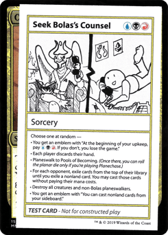 Choose one at random — • You get an emblem with "At the beginning of your upkeep, pay {U}{B}{R}. If you don't, you lose the game." • Each player discards their hand. • Planeswalk to Pools of Becoming. (Once there, you can roll the planar die only if you're playing Planechase.) • For each opponent, exile cards from the top of their library until you exile a nonland card. You may cast those cards without paying their mana costs. • Destroy all creatures and non-Bolas planeswalkers. • You get an emblem with "You can cast nonland cards from your sideboard."