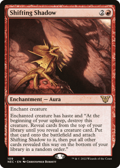 Enchant creature Enchanted creature has haste and "At the beginning of your upkeep, destroy this creature. Reveal cards from the top of your library until you reveal a creature card. Put that card onto the battlefield and attach Shifting Shadow to it, then put all other cards revealed this way on the bottom of your library in a random order."