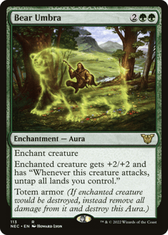 Enchant creature Enchanted creature gets +2/+2 and has "Whenever this creature attacks, untap all lands you control." Umbra armor (If enchanted creature would be destroyed, instead remove all damage from it and destroy this Aura.)