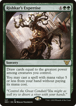 Draw cards equal to the greatest power among creatures you control. You may cast a spell with mana value 5 or less from your hand without paying its mana cost.