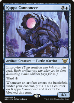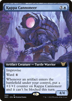 Improvise (Your artifacts can help cast this spell. Each artifact you tap after you're done activating mana abilities pays for {1}.) Ward {4} Whenever this creature or another artifact you control enters, put a +1/+1 counter on this creature and it can't be blocked this turn.