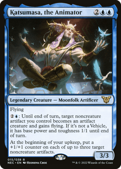Flying {2}{U}: Until end of turn, target noncreature artifact you control becomes an artifact creature and gains flying. If it's not a Vehicle, it has base power and toughness 1/1 until end of turn. At the beginning of your upkeep, put a +1/+1 counter on each of up to three target noncreature artifacts.