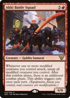 Whenever one or more modified creatures you control attack, untap all modified creatures you control. After this phase, there is an additional combat phase. This ability triggers only once each turn. (Equipment, Auras you control, and counters are modifications.)