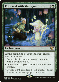 At the beginning of your end step, choose one or more — • Put a +1/+1 counter on target creature with a counter on it. • Draw a card if you control an enchanted creature. • Create a 1/1 colorless Spirit creature token if you control an equipped creature.