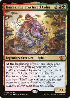 At the beginning of your end step, goad each creature your opponents control that's enchanted by an Aura you control. Put a +1/+1 counter on Kaima for each creature goaded this way. (Until your next turn, the goaded creatures attack each combat if able and attack a player other than you if able.)
