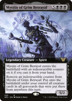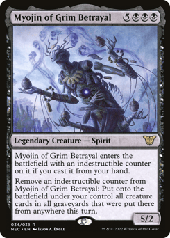 Myojin of Grim Betrayal enters with an indestructible counter on it if you cast it from your hand. Remove an indestructible counter from Myojin of Grim Betrayal: Put onto the battlefield under your control all creature cards in all graveyards that were put there from anywhere this turn.