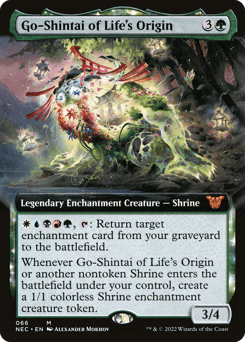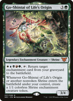 {W}{U}{B}{R}{G}, {T}: Return target enchantment card from your graveyard to the battlefield. Whenever Go-Shintai of Life's Origin or another nontoken Shrine you control enters, create a 1/1 colorless Shrine enchantment creature token.