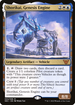 {1}, {T}: Draw two cards, then discard a card. Create a 1/1 colorless Pilot creature token with "This token crews Vehicles as though its power were 2 greater." Crew 8 (Tap any number of creatures you control with total power 8 or more: This Vehicle becomes an artifact creature until end of turn.) Shorikai, Genesis Engine can be your commander.