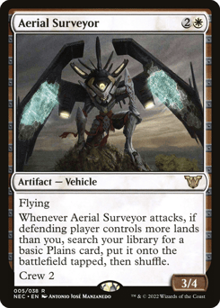 Flying Whenever this Vehicle attacks, if defending player controls more lands than you, search your library for a basic Plains card, put it onto the battlefield tapped, then shuffle. Crew 2
