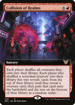Each player shuffles all creatures they own into their library. Each player who shuffled a nontoken creature into their library this way reveals cards from the top of their library until they reveal a creature card, then puts that card onto the battlefield and the rest on the bottom of their library in a random order.