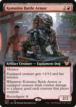Menace Equipped creature gets +2/+2 and has menace. Whenever this creature or equipped creature deals combat damage to a player, goad each creature that player controls. Reconfigure {4} ({4}: Attach to target creature you control; or unattach from a creature. Reconfigure only as a sorcery. While attached, this isn't a creature.)
