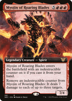 Myojin of Roaring Blades enters with an indestructible counter on it if you cast it from your hand. Remove an indestructible counter from Myojin of Roaring Blades: It deals 7 damage to each of up to three targets.