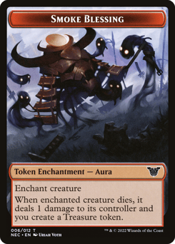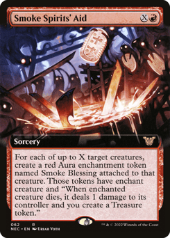 For each of up to X target creatures, create a red Aura enchantment token named Smoke Blessing attached to that creature. Those tokens have enchant creature and "When enchanted creature dies, it deals 1 damage to its controller and you create a Treasure token."