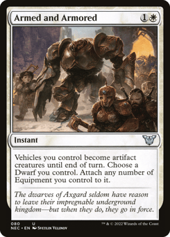 Vehicles you control become artifact creatures until end of turn. Choose a Dwarf you control. Attach any number of Equipment you control to it.