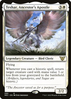 Flying Whenever you cast a historic spell, return target creature card with mana value 3 or less from your graveyard to the battlefield. (Artifacts, legendaries, and Sagas are historic.)
