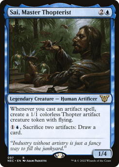 Whenever you cast an artifact spell, create a 1/1 colorless Thopter artifact creature token with flying. {1}{U}, Sacrifice two artifacts: Draw a card.