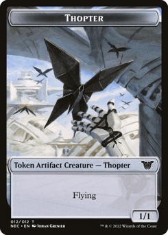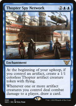 At the beginning of your upkeep, if you control an artifact, create a 1/1 colorless Thopter artifact creature token with flying. Whenever one or more artifact creatures you control deal combat damage to a player, draw a card.