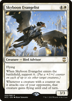 Flying When this creature enters, support 6. (Put a +1/+1 counter on each of up to six other target creatures.) Whenever a creature with a counter on it attacks one of your opponents, that creature gains flying until end of turn.