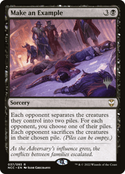 Each opponent separates the creatures they control into two piles. For each opponent, you choose one of their piles. Each opponent sacrifices the creatures in their chosen pile. (Piles can be empty.)