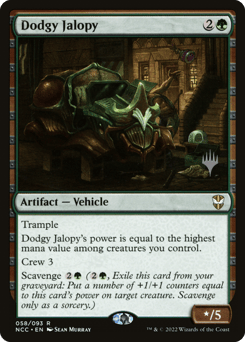 Trample Dodgy Jalopy's power is equal to the greatest mana value among creatures you control. Crew 3 Scavenge {2}{G} ({2}{G}, Exile this card from your graveyard: Put a number of +1/+1 counters equal to this card's power on target creature. Scavenge only as a sorcery.)
